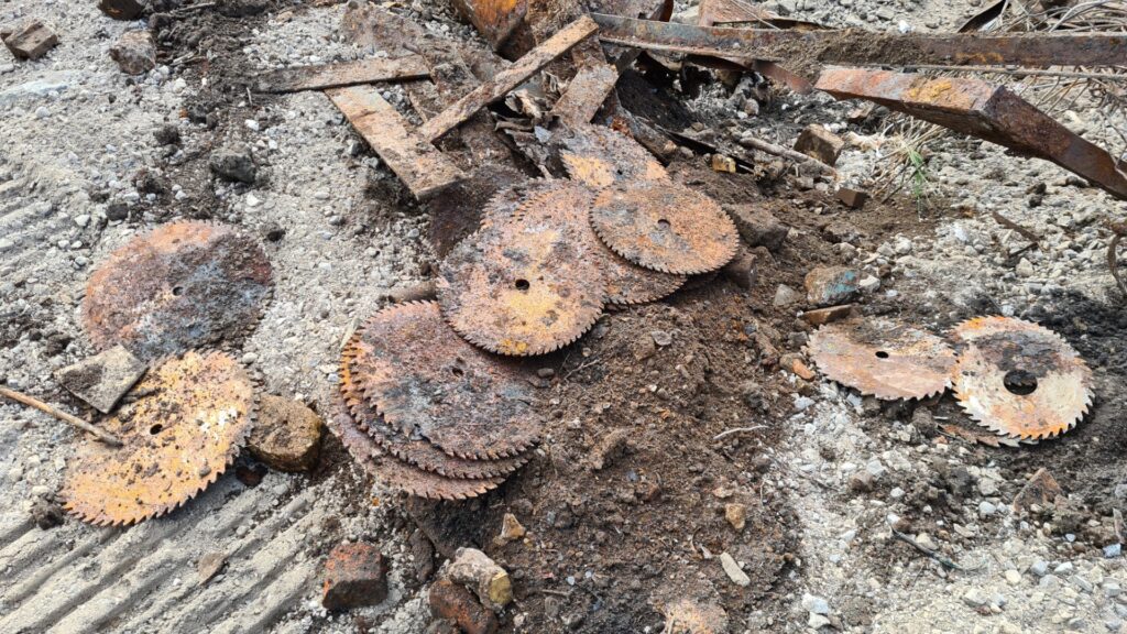 Bland avfallet hittades bl.a rostiga sågklingor, krossat glas, gamla slipstenar och en fortfarande tillsluten gasflaska som fick hanteras av experter.