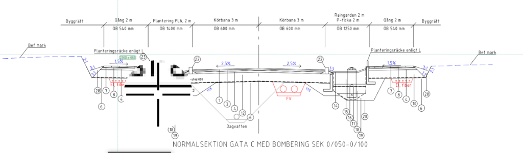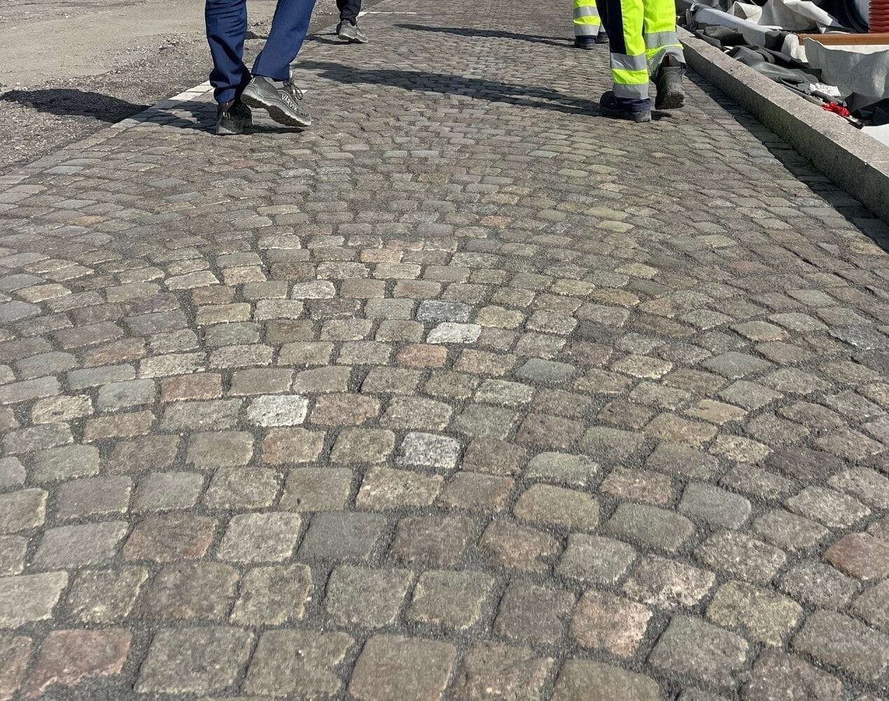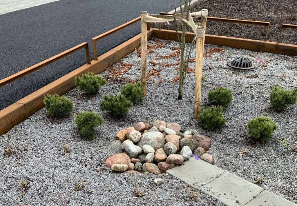 Markbeläggning av olika slag har alltså kommit på plats. Asfalt, marktegel, betongplattor och återvunnen kullersten varvas med mjukare inslag som trädäck, planteringslådor och corten som tillsammans skapar en dynamisk, levande och vacker miljö som speglar historia och framtid.