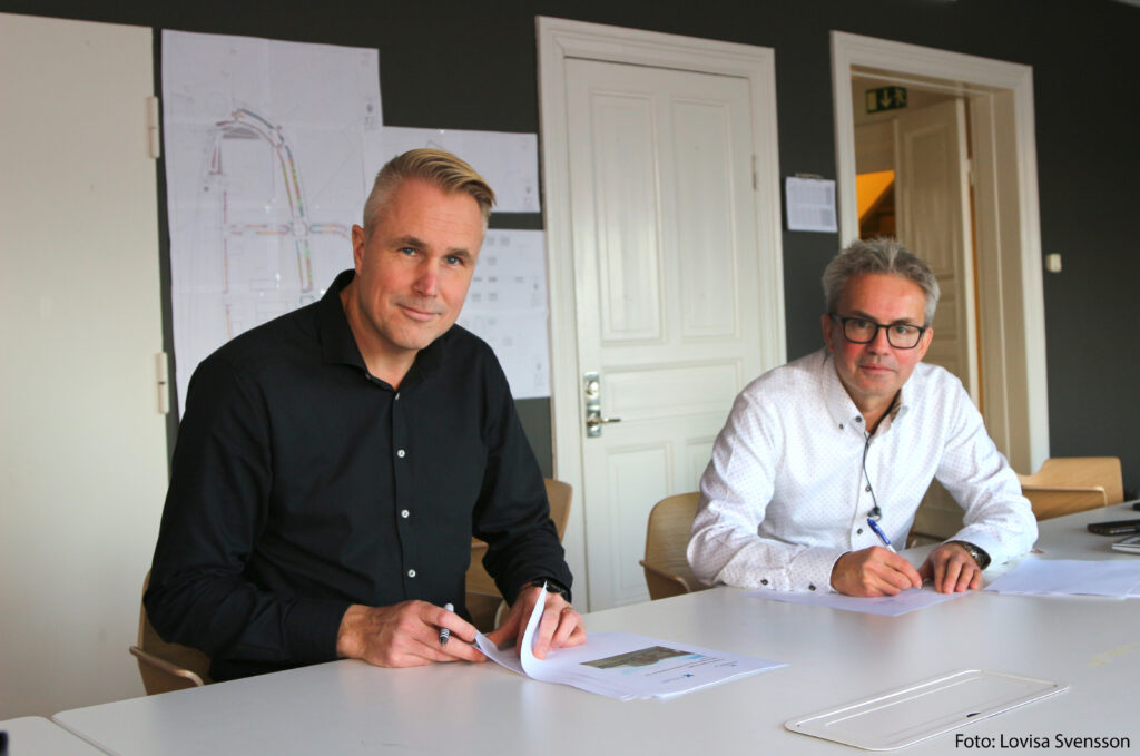 Sebastian Bleckert, Peab och Anders Torslid, Trollhättan Exploatering skrev under torsdag eftermiddag på kontraktet på plats på Vårvik.